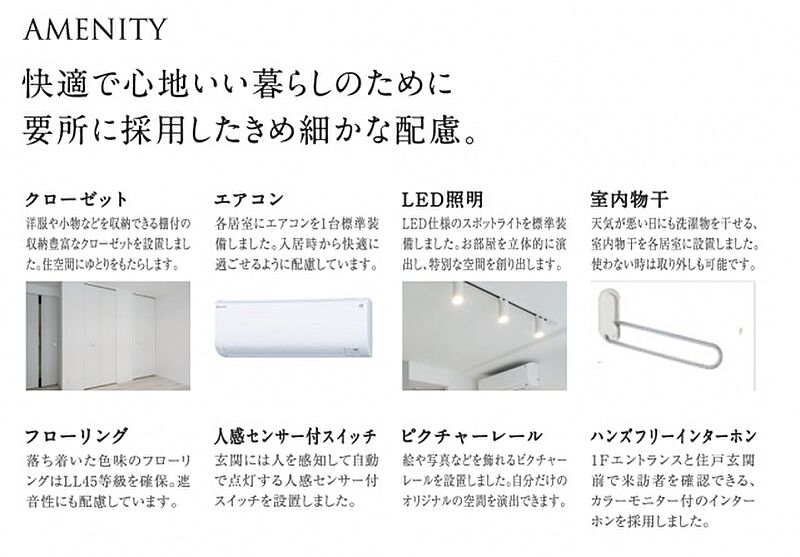 設備・条件 | 楽器不可、事務所不可、ルームシェア不可、ペット不可、オートロック、防犯カメラ、TVモニタ付インターホン、宅配ボックス、エアコン、コンロ二口、システムキッチン、給湯、公営水道、プロパンガス、下水、専用バス、専用トイレ、バス・トイレ別、シャワー付洗面化粧台、温水洗浄便座、浴室乾燥機、洗面所独立、CATV、インターネット使用料無料、クローゼット、シューズボックス、フローリング、室内洗濯機置場、エレベーター、照明器具付き、バイク置き場あり、駐輪場あり、デザイナーズ |